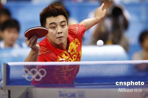 8月21日,北京奧運(yùn)會(huì)乒乓球男子單打第三輪的比賽在北京大學(xué)體育館進(jìn)行,中國(guó)選手王皓4比0戰(zhàn)勝奧地利選手陳衛(wèi)星晉級(jí)下一輪比賽。圖為王皓在比賽中。中新社發(fā) 盛佳鵬 攝
