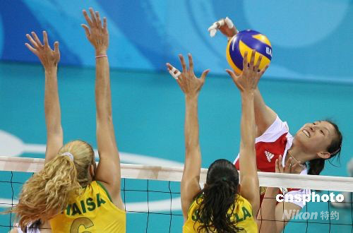 8月21日,中國(guó)女排在北京奧運(yùn)會(huì)女排半決賽中以0:3負(fù)于巴西隊(duì),無緣決賽。中新社發(fā) 武仲林 攝