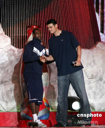 圖為姚明、詹姆斯與小球迷互動(dòng)。
