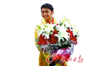 昨天,女子沙灘排球頒獎(jiǎng)儀式在大雨中隆重舉行,之后三對(duì)獲獎(jiǎng)選手陸續(xù)走過(guò)混合區(qū)。此刻,混合區(qū)外邊一個(gè)獨(dú)特的“景致”吸引了大家的注意:一個(gè)高大帥氣的小伙子手捧一束玫瑰,安靜地等待著。他正是田佳在八一沙排隊(duì)的隊(duì)友兼男友鄭鴻勇(見(jiàn)右圖),“本來(lái)不讓他來(lái)看比賽,不過(guò)到了16進(jìn)8的淘汰賽后他非得要來(lái),那我就找來(lái)票給他,每次他都坐在我可以找到的地方。”這也揭開(kāi)了大家的一個(gè)疑問(wèn),從淘汰賽開(kāi)始,田佳每贏得一場(chǎng)勝利都會(huì)沖著觀眾席的某一個(gè)方向送出飛吻,原來(lái),她是有“目標(biāo)”的。