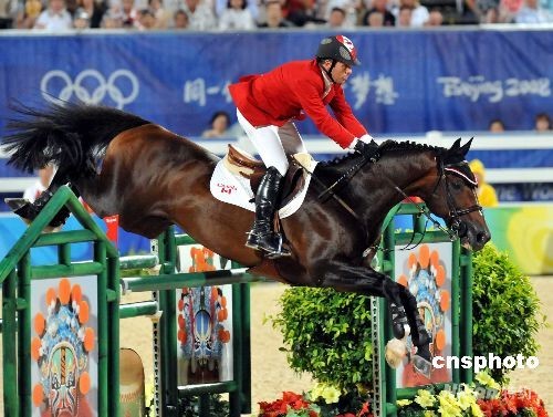 八月二十一日晚,奧運馬術(shù)在香港沙田賽場舉行場地障礙個人賽決賽。加拿大選手埃里克·拉馬茲策騎馬匹“?怂固氐隆壁A得金牌。中新社發(fā) 鄧慶樂 攝