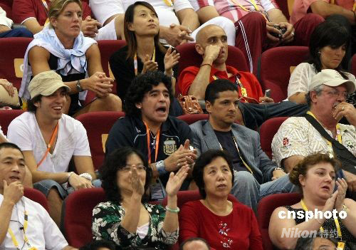 北京奧運(yùn)會(huì)男子籃球半決賽第二場(chǎng)比賽8月22日晚在五棵松籃球館開戰(zhàn),志在奪冠的美國(guó)“夢(mèng)八隊(duì)”遭遇雅典奧運(yùn)會(huì)冠軍阿根廷隊(duì),最后美國(guó)隊(duì)以101比81擊敗阿根廷隊(duì),進(jìn)入決賽。“球王”馬拉多納到場(chǎng)為本國(guó)球隊(duì)助威加油。中新社發(fā) 任晨鳴 攝