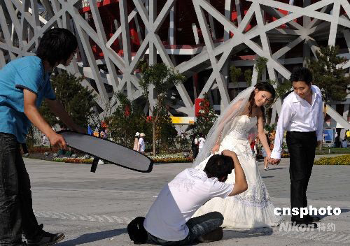 圖:北京新人在奧林匹克公園內(nèi)拍攝婚紗照