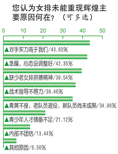 本次調(diào)查發(fā)現(xiàn),女排敗給對手,43.6%的人認為是對手實力高于我們,42.4%的人認為緣于我們自己急躁,沒有調(diào)整好心態(tài)。39.5%的人認為,目前的女排缺少當年老女排的拼搏精神。