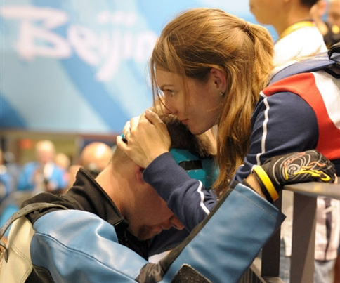 賽場上,埃蒙斯最后一槍僅打出4.4環(huán),到手的冠軍拱手相送。失落的埃蒙斯走到妻子的面前,這位射落本屆奧運會首金的捷克女神槍手,捧起丈夫的臉,輕輕地摩挲,用深情的注視和呢喃來安慰他……,就像卡特琳娜奪金之后與丈夫深情一吻一樣,這一刻也給觀眾留下了深刻而溫馨的印象。