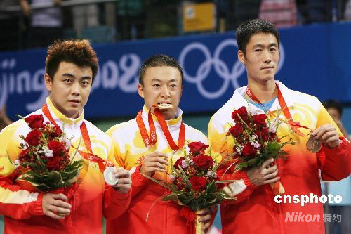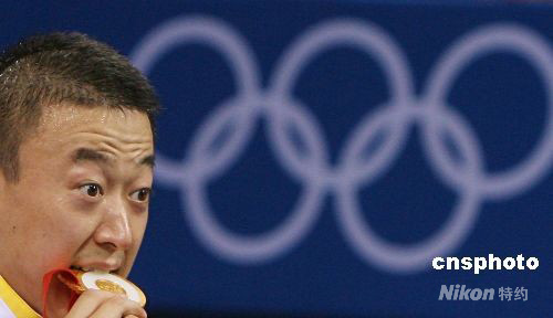 圖為奪得冠軍的馬琳在領(lǐng)獎(jiǎng)臺(tái)上激動(dòng)地口銜金牌。