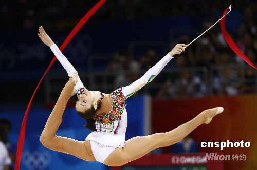 8月23日晚,在北京工業(yè)大學(xué)體育館舉行的北京奧運(yùn)會(huì)藝術(shù)體操個(gè)人全能決賽中,烏克蘭選手加娜·別茲索諾娃獲得銅牌。圖為加娜·別茲索諾娃在比賽中。 中新社發(fā) 盛佳鵬 攝