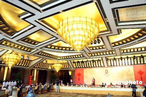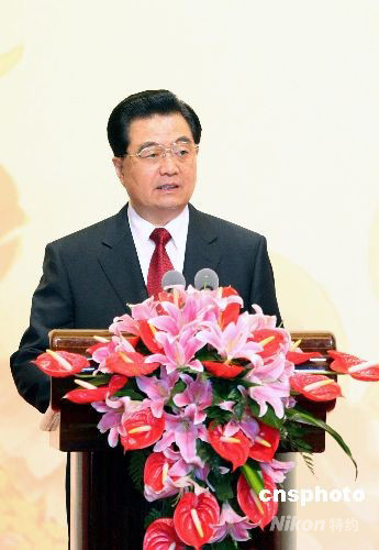 8月24日,中國(guó)國(guó)家主席胡錦濤和夫人劉永清在北京釣魚(yú)臺(tái)國(guó)賓館舉行宴會(huì),款待前來(lái)出席北京奧運(yùn)會(huì)閉幕式的國(guó)際貴賓。胡錦濤在宴會(huì)上致辭。中新社發(fā) 廖文靜 攝