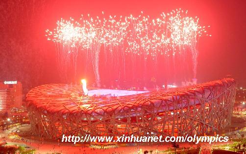 8月24日,第29屆夏季奧運會閉幕式在國家體育場——“鳥巢”舉行。這是閉幕式上燃放的焰火。 新華社記者 李鋼 攝