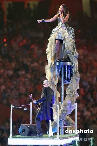 8月24日晚,北京奧運(yùn)會(huì)閉幕式在奧林匹克公園內(nèi)的國(guó)家體育場(chǎng)舉行,下屆奧運(yùn)會(huì)主辦地倫敦市在“鳥(niǎo)巢”上演倫敦8分鐘節(jié)目,在英國(guó)大型選秀節(jié)目“XFactor”中脫穎而出的偶像歌手利昂娜·劉易斯與英國(guó)著名搖滾樂(lè)隊(duì)“齊柏林飛船”的主音吉他手吉米·佩齊聯(lián)袂獻(xiàn)歌;還有英國(guó)民歌、都市街舞、Hip-Hop霹靂舞等表演。中新社發(fā) 任晨鳴 攝