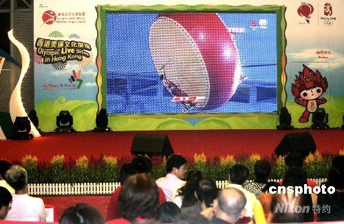 八月二十四日晚,香港市民正在香港奧運文化廣場觀看北京奧運閉幕式直播。中新社發(fā) 張勤 攝