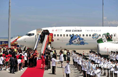 八月二十九日上午十一時,中國國家奧運金牌運動員代表團的六十三名成員乘坐飛機抵達香港機場,特區(qū)行政長官曾蔭權(quán)等官員到場迎接。 中新社發(fā) 譚達明 攝