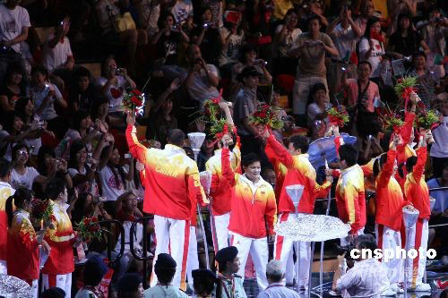 圖為運(yùn)動(dòng)員乘坐蓮花車入場(chǎng),受到熱烈歡迎。中新社發(fā) 洪少葵 攝