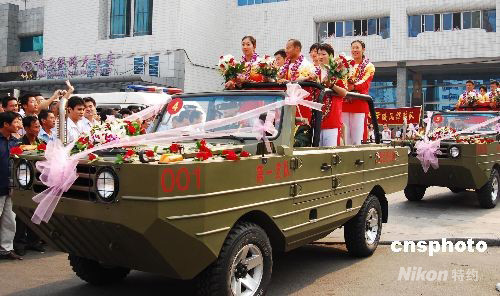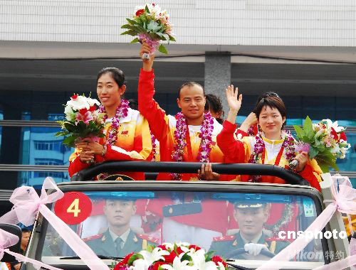 9月3日上午,楊文軍、吳靜鈺、金紫薇等江西籍的奧運冠軍乘火車抵達南昌,當?shù)孛癖娨詷逢、舞獅、鑼鼓等熱烈的方式迎接奧運英雄歸來。 中新社發(fā) 胡國林 攝