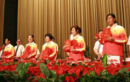 表彰會(huì)上,王峰等5名金牌運(yùn)動(dòng)員和教練員馬文輝、吳俐知被授予“山東青年五四杰出貢獻(xiàn)獎(jiǎng)?wù)隆保T淼等獲得“山東省新長(zhǎng)征突擊手標(biāo)兵”榮譽(yù)稱號(hào)。王峰、奚愛華等還榮獲山東省“富民興魯”勞動(dòng)獎(jiǎng)?wù)路Q號(hào),張娟娟、奚愛華還獲山東省三八紅旗手標(biāo)兵榮譽(yù)稱號(hào)和“山東省先進(jìn)工作者”。王峰、杜麗、劉春紅以及獲得銀牌、銅牌的運(yùn)動(dòng)員被記一等功。