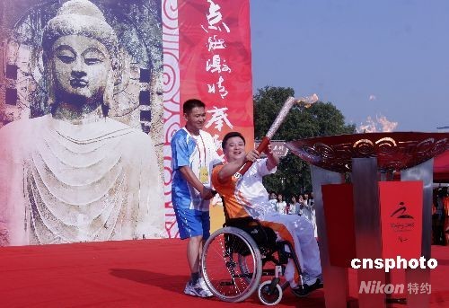 9月4日, 火炬手在最具洛陽(yáng)特色的城市名片——世界文化遺產(chǎn)龍門石窟景區(qū)內(nèi)傳遞殘奧會(huì)火炬。當(dāng)日,北京2008殘奧會(huì)火炬在千年帝都、牡丹花城洛陽(yáng)傳遞,這是火炬進(jìn)京前最后一站,共有65名火炬手參加。中新社發(fā) 張曉理 攝