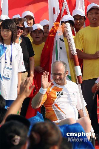 火炬手、國(guó)際殘奧委會(huì)(IPC)主席菲利普·克雷文(Philip Craven)傳遞火炬。中新社發(fā) 張宇 攝