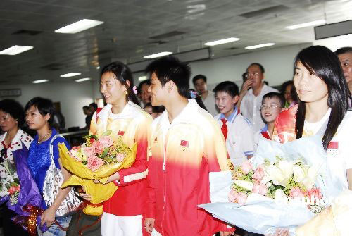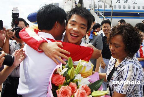 9月4日,剛參加完第29屆奧運(yùn)會(huì)廣東省總結(jié)表彰會(huì)的湛江籍奧運(yùn)冠軍何沖等飛抵湛江,受到湛江市政府和父老鄉(xiāng)親的熱烈歡迎。當(dāng)日上午,何沖母!拷械谒男W(xué)、赤坎區(qū)業(yè)余體育學(xué)師生代表和他的親朋好友,到湛江機(jī)場(chǎng)迎接何沖的歸來(lái)。同期抵湛江的還有湛江籍北京奧運(yùn)季軍、國(guó)家花樣游泳隊(duì)隊(duì)員劉鷗,國(guó)家女足運(yùn)動(dòng)員謝彩霞以及湛江籍運(yùn)動(dòng)健兒張小冬和上屆奧運(yùn)冠軍勞麗詩(shī)等,他們于當(dāng)天下午參加了湛江市的慶功表彰大會(huì),湛江市授予何沖湛江市勞動(dòng)模范稱號(hào);湛江市總工會(huì)授予劉鷗和謝彩霞“五一勞動(dòng)獎(jiǎng)?wù)隆狈Q號(hào);共青團(tuán)湛江市委授予劉鷗“湛江市模范共青團(tuán)員”稱號(hào),謝彩霞“湛江市模范青年崗位能手”稱號(hào);湛江市婦聯(lián)授予劉鷗和謝彩霞“三八紅旗手”稱號(hào)。中新社發(fā) 李滿青 攝