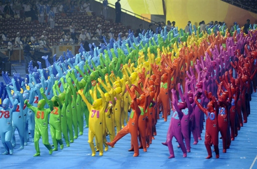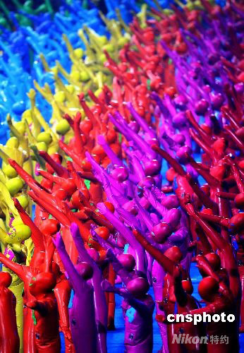 北京2008年殘奧會6日晚八時在國家體育場“鳥巢”揭開神秘面紗,在第一波焰火倒計時結(jié)束后,國際殘奧主席發(fā)出起跑令,無數(shù)身穿著奇異服裝,胸前標(biāo)有號碼的“卡通玩偶”們不斷跑入鳥巢,他們?yōu)閬碜愿鲊倪\動員鋪就一條彩色的跑道。