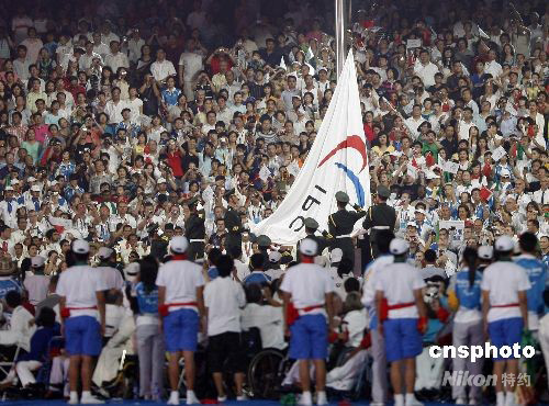 9月6日晚,北京2008殘奧會開幕式在國家體育場“鳥巢”舉行,殘奧會旗在“鳥巢”升起。 中新社發(fā) 杜洋 攝