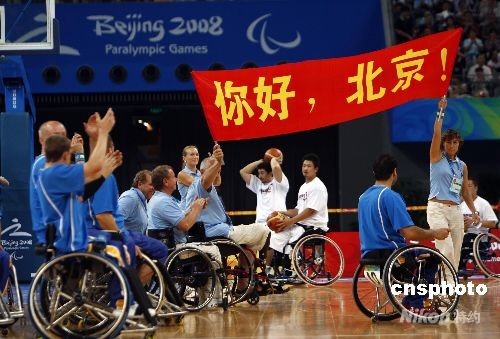9月7日,北京殘奧會(huì)輪椅籃球比賽中,瑞典隊(duì)在比賽結(jié)束時(shí)打出了“你好,北京!”、“謝謝!中國(guó)!”的標(biāo)語(yǔ)。中新社發(fā) 杜洋 攝