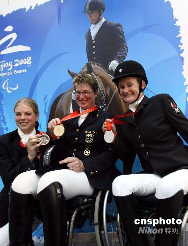 九月八日上午,德國(guó)選手布麗塔·納佩爾(中)在香港奪得北京殘奧會(huì)馬術(shù)比賽個(gè)人錦標(biāo)賽科目級(jí)別Ⅱ冠軍,摘取殘奧會(huì)馬術(shù)比賽首金,加拿大選手勞倫·巴威克(右)獲得銀牌,丹麥選手卡羅琳·尼爾森獲銅牌。中新社發(fā) 洪少葵 攝