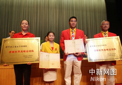 中新網(wǎng)杭州9月8日電(記者 江耘 柴燕菲) 孟關(guān)良、江鈺源、朱啟南、周蘇紅……不久前在北京奧運(yùn)會(huì)上奮力拼搏的浙江籍奧運(yùn)健兒們,今天聚會(huì)在浙江省人民大會(huì)堂里。浙江省委、省政府為他們舉行了歡迎浙江奧運(yùn)健兒凱旋暨慶功表彰大會(huì),并獎(jiǎng)勵(lì)奧運(yùn)冠軍人民幣六十萬(wàn)元人民幣。