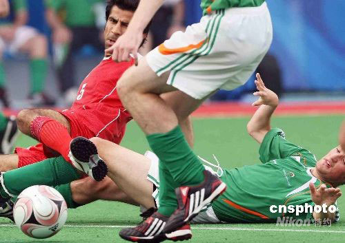北京殘奧會七人制(男子)足球比賽9月8日在北京奧林匹克公園內(nèi)的橄欖球場開賽,伊朗隊以4比2擊敗愛爾蘭隊。圖為伊朗隊5號哈迪·薩法理(紅)拼死防守愛爾蘭隊的最后進(jìn)攻。殘奧會七人制(男子)足球比賽在橄欖球賽場舉行,全場共60分鐘,隊員為腦癱患者。 中新社發(fā) 任晨鳴 攝