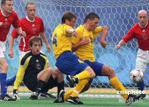 北京殘奧會七人制(男子)足球比賽9月8日在北京奧林匹克公園內(nèi)的橄欖球場開賽,實(shí)力超群的烏克蘭隊(duì)以8比1擊敗英國隊(duì)。圖為獨(dú)中三元的烏克蘭隊(duì)6號伊萬·什克瓦洛(黃)在英國隊(duì)禁區(qū)內(nèi)恣意沖殺,如入無人之境。殘奧會七人制(男子)足球比賽在橄欖球賽場舉行,全場共60分鐘。 中新社發(fā) 任晨鳴 攝