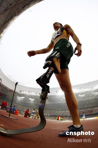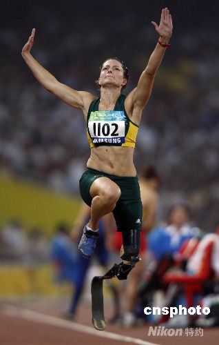 9月8日,北京殘奧會女子跳遠(yuǎn)F42級決賽上,澳大利亞選手克里斯蒂娜·沃爾夫以3米73獲得冠軍,獲得亞軍和季軍的分別是荷蘭選手安妮特·羅曾和波蘭選手埃娃·杰琳斯卡,成績分別為3米63和3米62。中國選手張海原以3米44名列第五。冠軍沃爾夫6跳全部成功,最好成績出現(xiàn)在第五跳的3米73,這也打破了張海原在雅典奧運(yùn)上創(chuàng)造的3米67的世界記錄。 中新社發(fā) 杜洋 攝
