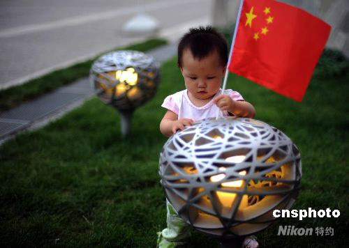 9月8日,北京正在舉辦殘奧會的國家體育場外,一位可愛的小朋友往“鳥巢路燈”上插國旗。中新社發(fā) 廖攀 攝