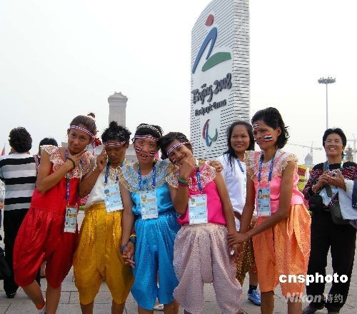 2008年9月8日,為北京殘奧會(huì)助威的泰國“啦啦隊(duì)”成員來到天安門廣場(chǎng)游覽,并高興地拍照留影。中新社發(fā) 玉龍 攝