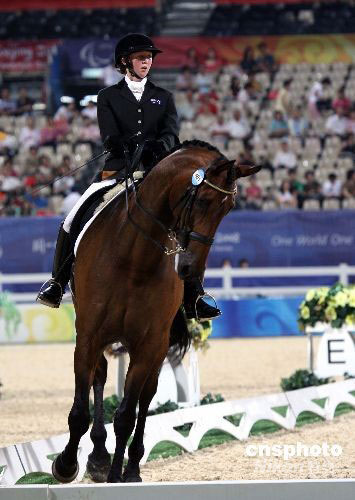 九月八日晚,在香港殘奧馬術(shù)“盛裝舞步團(tuán)體賽”賽中,澳大利亞選手喬治婭·布魯斯策騎“薩魯特”展示實(shí)力,獲得六十八點(diǎn)二五八分。為期五天的北京殘奧委會(huì)馬術(shù)項(xiàng)目,有來(lái)自二十八個(gè)國(guó)家和地區(qū)的七十三名選手及七十一匹參賽馬匹將角逐十一枚金牌,參賽國(guó)家和地區(qū)數(shù)目、選手和馬匹數(shù)目都創(chuàng)歷史記錄。中新社發(fā) 洪少葵 攝