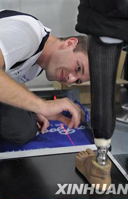 圖為9月8日,維修人員通過激光校準(zhǔn)儀在為一名俄羅斯運(yùn)動(dòng)員的“左腳”進(jìn)行檢測(cè)。新華社記者 陳曉偉攝
