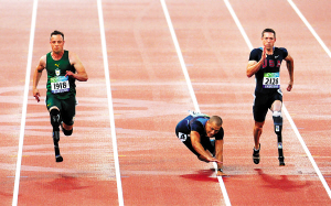 毫無疑問,南非“刀鋒戰(zhàn)士”奧斯卡·皮斯托留斯是昨晚“鳥巢”的英雄。在男子100米-T44級別的比賽中,他以11秒17的成績贏得金牌。然而,勝利者身后,跌倒而堅持完成比賽的美國選手馬龍·雪利卻贏得了更多的感動。