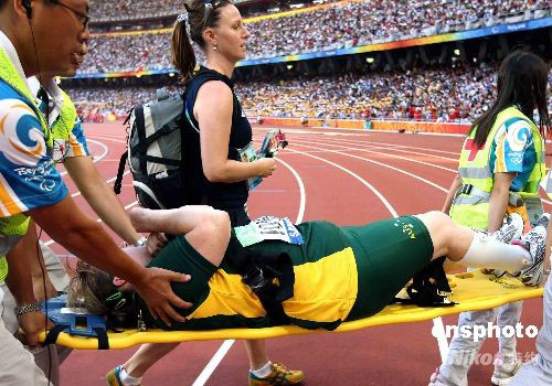 9月12日,北京殘奧會(huì)田徑比賽舉行在北京奧林匹克公園內(nèi)的國(guó)家體育場(chǎng)-鳥巢舉行,澳大利亞女子鉛球選手卡思·普勞德福特在上午進(jìn)行的女子鉛球-F35/36級(jí)別的比賽第五次投擲后當(dāng)場(chǎng)昏厥,被緊急送往醫(yī)院救治。 中新社發(fā) 任晨鳴 攝