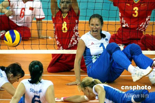 北京殘奧會坐式排球女子半決賽9月12日在北京農(nóng)業(yè)大學(xué)體育館舉行,中國女隊以3比0橫掃斯洛文尼亞闖進(jìn)決賽,將與美國女隊爭奪冠軍。中新社發(fā) 任晨鳴 攝