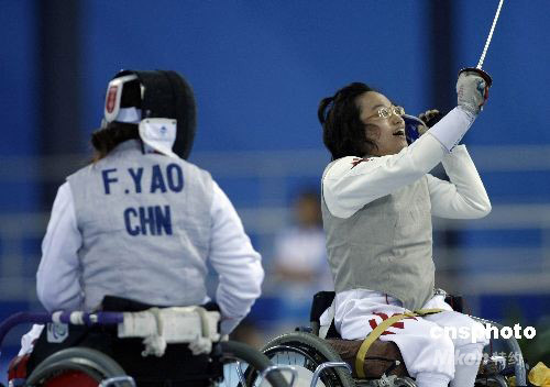 9月14日,北京殘奧會輪椅擊劍在北京國家會議中心擊劍館進(jìn)入首個比賽日,在女子個人花劍B級決賽中,頭號種子中國香港選手陳蕊莊以15-8戰(zhàn)勝9號種子中國選手姚芳,奪得金牌。 中新社發(fā) 盛佳鵬 攝