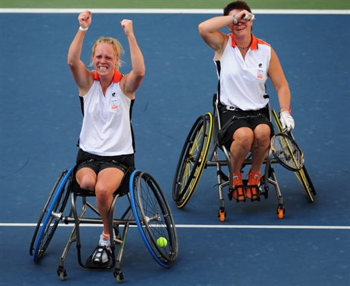 9月15日,北京殘奧會輪椅網(wǎng)球女雙總決賽中,荷蘭22歲的科麗·霍曼(左)和莎倫·瓦爾拉芬2-1戰(zhàn)勝同胞埃絲特·費海爾和伊斯克·格里菲翁,取得本屆殘奧會輪椅網(wǎng)球女雙金牌。賽后這對組合喜極而泣。