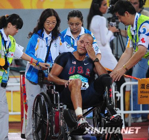 9月9日,在國(guó)家體育場(chǎng)進(jìn)行的北京2008年殘奧會(huì)男子100米T44級(jí)決賽中,有實(shí)力爭(zhēng)奪獎(jiǎng)牌的美國(guó)選手馬龍·雪利在比賽途中摔倒。這位美國(guó)選手最終眼含遺憾的淚水離開(kāi)了賽場(chǎng)。新華社記者 李尕 攝