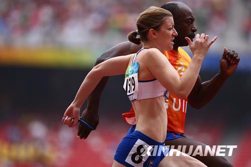 英國(guó)選手莉比·克萊格(前)在領(lǐng)跑員的引導(dǎo)下進(jìn)行女子100米T12級(jí)預(yù)賽。新華社記者 張燕輝 攝