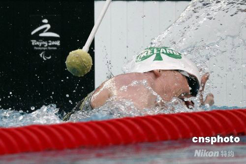 北京2008年殘奧會(huì)游泳S11級(jí)男子400米自由泳預(yù)賽,在北京國(guó)家游泳中心“水立方”進(jìn)行,教練在泳池邊為選手“指路”。中新社發(fā) 盛佳鵬 攝