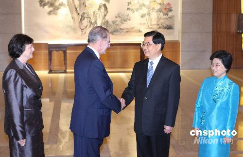 9月17日,中國(guó)國(guó)家主席胡錦濤與夫人劉永清在北京釣魚(yú)臺(tái)國(guó)賓館芳菲苑舉行宴會(huì)歡迎出席北京殘奧會(huì)閉幕式的國(guó)際貴賓。圖為胡錦濤與夫人迎接國(guó)際奧委會(huì)主席羅格夫婦。中新社發(fā) 廖文靜 攝