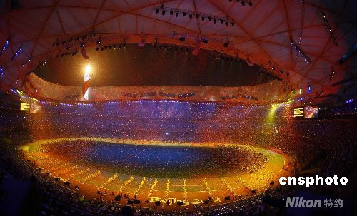 9月17日晚,北京2008年殘奧會閉幕式在國家體育場“鳥巢”盛大舉行。閉幕式上灑遍“鳥巢”的香山紅葉和殘奧圣火交相輝映。 中新社發(fā) 盛佳鵬 攝