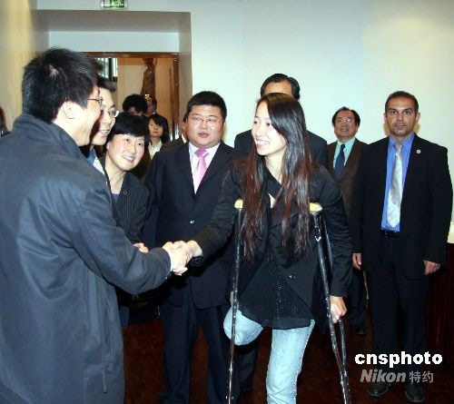 十九日晚,曾與中國奧運火炬手金晶結下“戰(zhàn)斗友誼”的旅法華僑華人和中國留學生在巴黎舉行歡迎會,以掌聲和親情迎接金晶重返巴黎,訪問法國。圖為金晶與部分一同參與北京奧運火炬巴黎傳遞的華人與留學生火炬手、護衛(wèi)手等“老戰(zhàn)友”喜重逢。中新社發(fā) 吳衛(wèi)中 攝