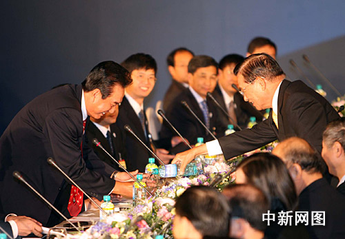 圖:會(huì)談間隙陳云林江丙坤互相倒水顯溫情