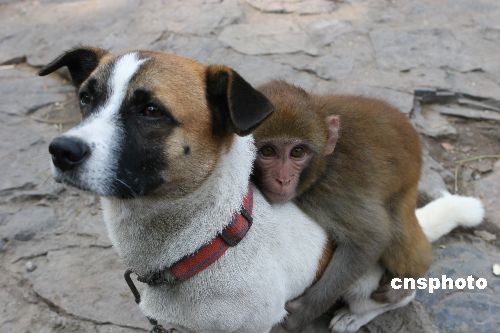 趣圖:猴寶寶認狗為“父” 仗狗勢猴山稱“王”