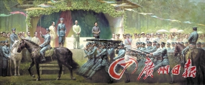 對于潘嘉俊來說,他的黃埔情結(jié)似乎更加濃烈些,21年的軍旅生涯讓他對軍事題材的創(chuàng)作格外有激情,“我熟悉黃埔軍校,并畫過有關(guān)的連環(huán)畫、單幅油畫和肖像畫”,他說,至今尚未出現(xiàn)一幅表現(xiàn)黃埔軍校歷史的大型美術(shù)作品,同時(shí),“人們記憶中關(guān)于閱兵的場景作品也極少”,因此,“另辟蹊徑、獨(dú)樹一幟”成為潘嘉俊選題的立意。
