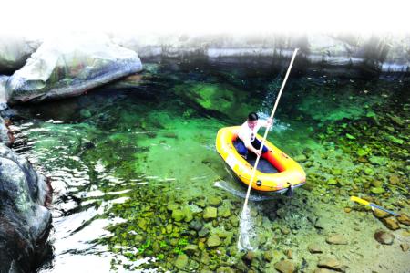 水清見底,看來不過一米?捎冒哆叾讨窀鸵徊澹股钣泻脦酌住S纱颂,必坐皮艇不可。同行人脫褲下水,想用竹竿勾來,可惜竿還是不夠長,而水已沒至腰。