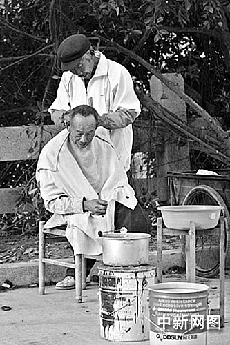 中新網(wǎng)晉江2月20日電 (秦越 )在上個(gè)世紀(jì)五六十年代,“剃頭挑子”很流行,就是一個(gè)理發(fā)師傅挑著擔(dān)子搖著鈴鐺走街串巷,擔(dān)子一頭是洗臉盆架和一個(gè)生著火的爐子,另一頭是一條長板凳,專門給人理發(fā)。近日,記者在閩南僑鄉(xiāng)晉江市區(qū)蓮溪路上就遇見一個(gè)這樣的“剃頭”師傅:和以前不一樣的是長板凳換成了靠背椅,扁擔(dān)換成了三輪自行車。